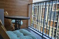 На балконе столик со стульями и сушилка для белья.